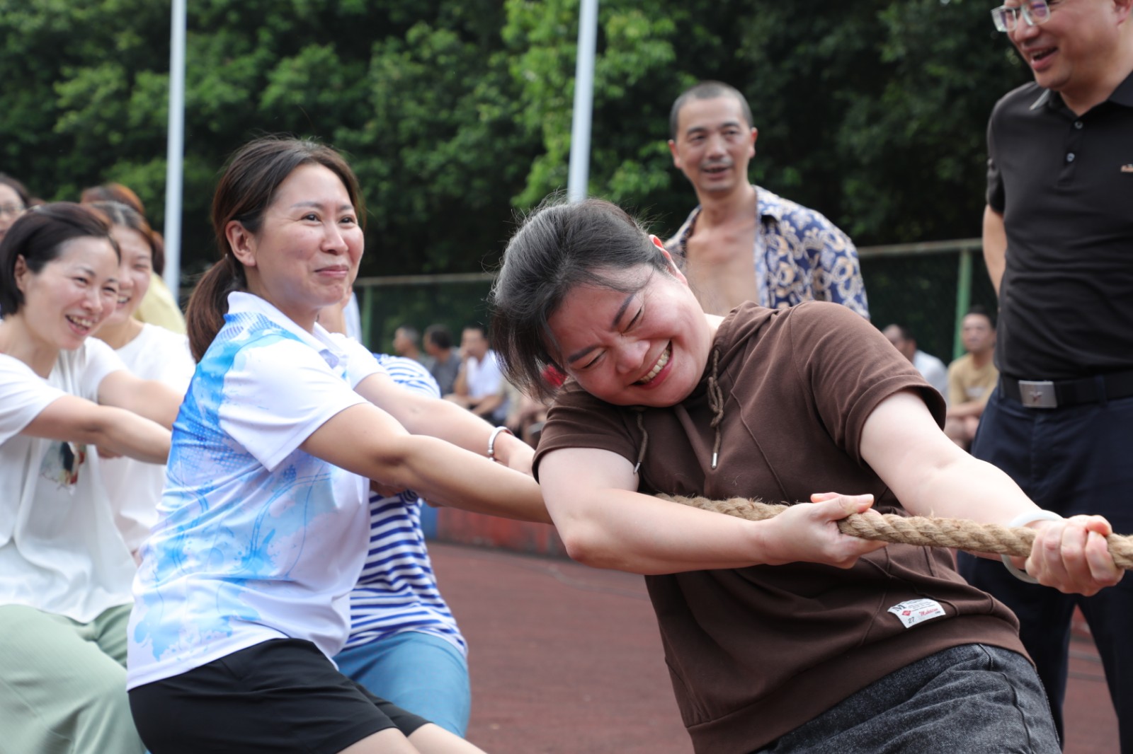 现场参赛男子组12个队,女子组4个队,男子组分4个组比赛,小组第一名出线后进行交叉比赛;女子组采用单循环赛,每场比赛均采用三局二胜赛制。比赛尚未开始,双方就已进入“战斗”状态,双手紧握绳子,双脚用力着地,身体向后微倾,随着一声哨响,队员们都铆足了劲往后拉,憋得满脸通红,反复争夺;落后一局的队员在交换场地后打气鼓劲,使出浑身解数,势在扭转局面。这已不是一场简单的战队实力之间的较量,参赛队员们秉承煤矿“燃烧精神”,通力合作,齐心协力,个个精神抖擞、斗志昂扬,拉拉队员和观众们心潮澎湃,情绪激扬的助威呐喊将拔河比赛推向了高潮。
