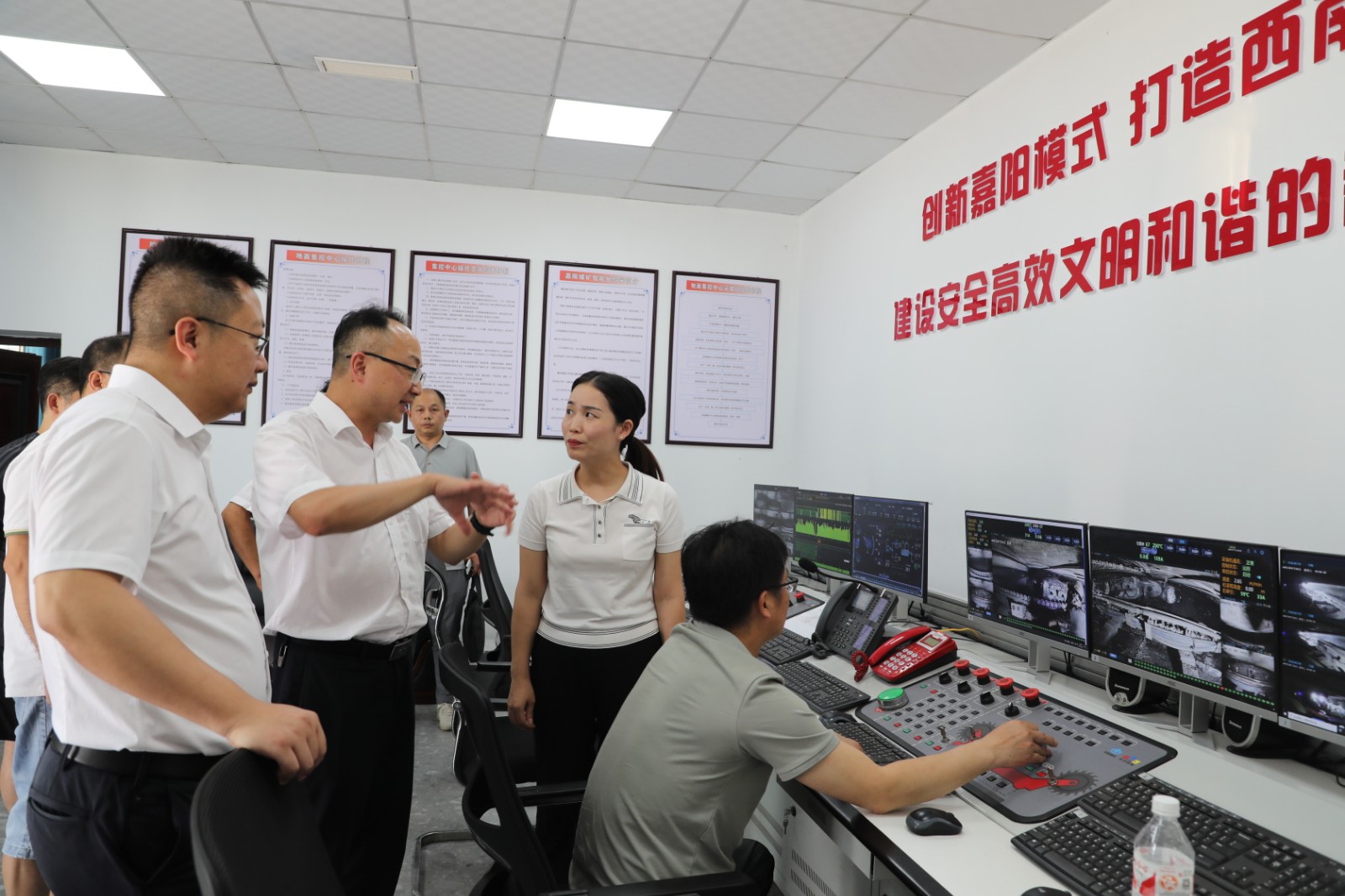 汪毅娟一行察看了嘉阳煤矿采煤一队地面采煤集控室,详细了解了智能化综采生产情况以及嘉阳近期工作安排部署和防暑降温措施落实情况。